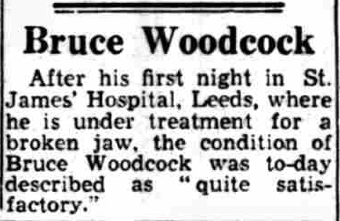 Bruce had been taken to Leeds Royal Hospital to treat a shattered jaw. His his face was shored up with steel splints. According to the ghost-written autobiography