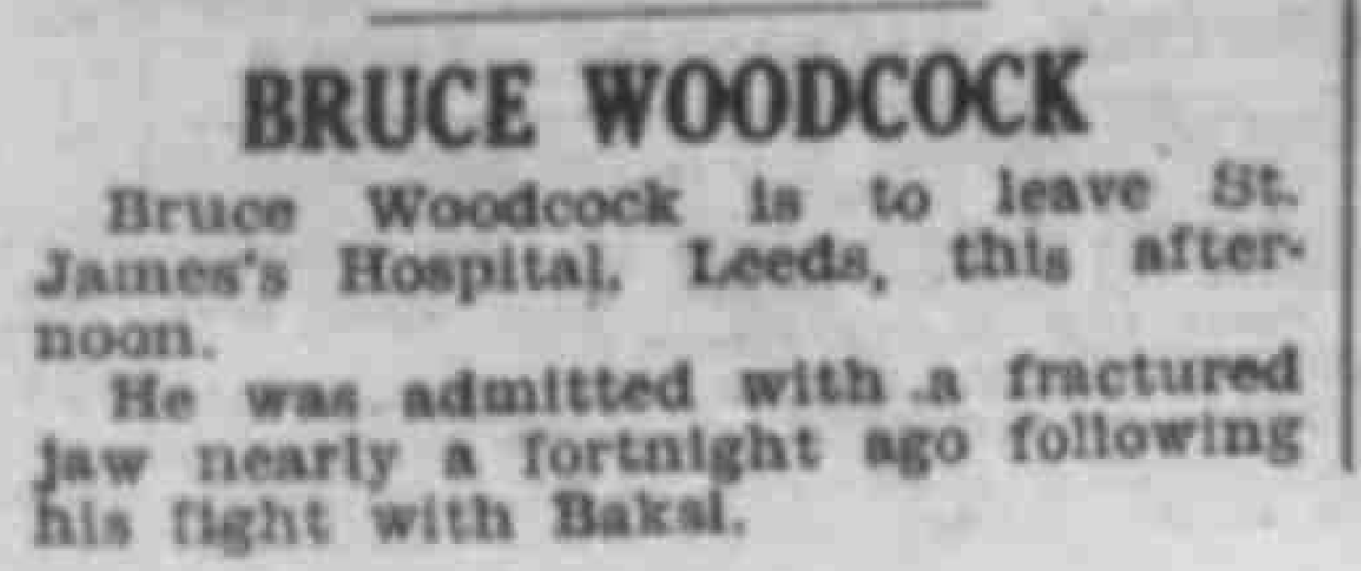 After the fight, Baksi was magnanimous in his praise for Bruce’s courage, pluck and determination, and sent Bruce a personal message of concern to the hospital. He also issued a public statement of his “profound regret” for Bruce’s broken jaw. Baksi’s trainer Ray Marcell said: “Woodcock has my sympathy. We won’t want to inflict that kind of damage to any man in a fight whatever is at stake. Bruce is such a game boy that it was a pity he sustained those nasty cuts, but a broken jaw - I am dreadfully sorry to hear about it.”