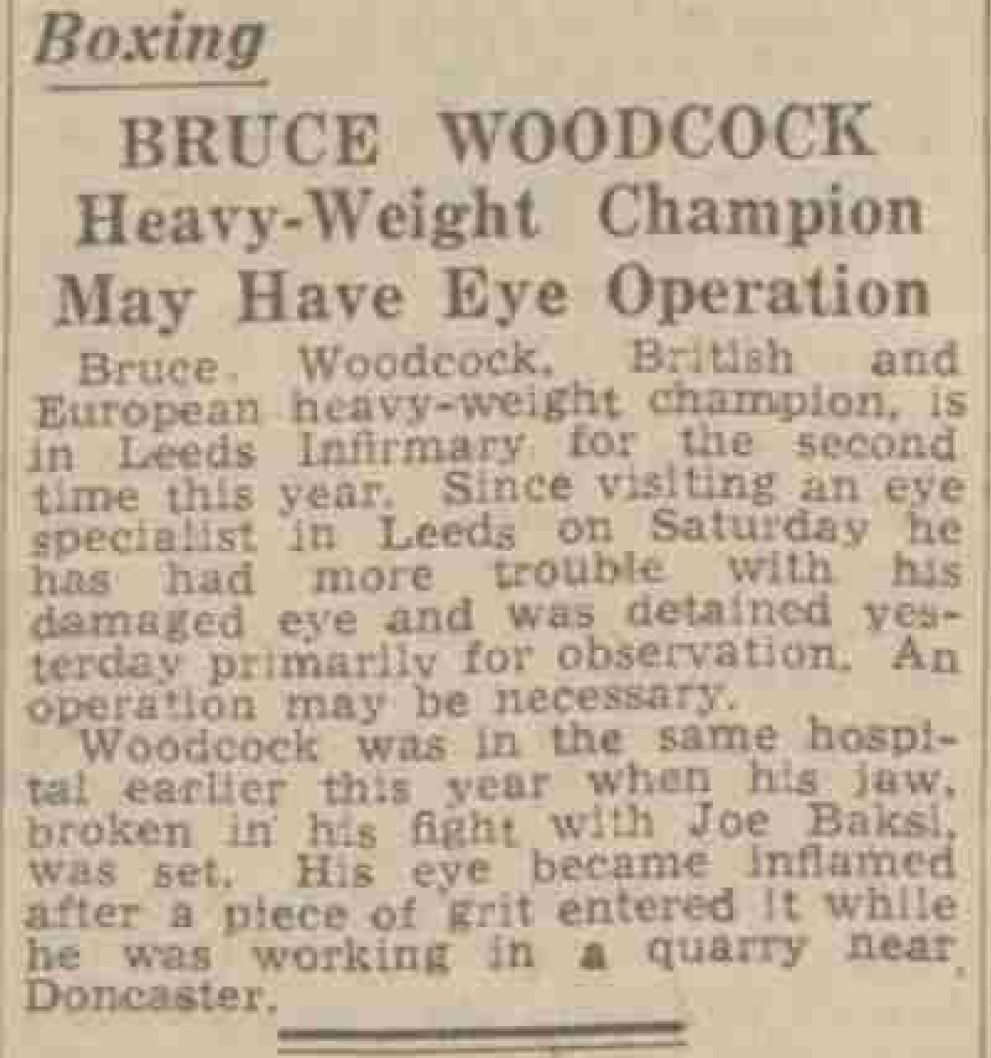 Bruce had recovered from the shattered jaw, but he now faced an equally devastating injury, compounded by the damage inflicted by the Baksi fight. He began light training, and in October Bruce decided some pick and shovel work in a local quarry would help rebuild his arms and shoulders. Unfortunately, a small piece of grit was sent flying and went into his right eye. After attempts to remove it by everyone concerned, Bruce went to Leeds Infirmary where doctors examined him for the grit but found in addition that there were small fragments of the bone from the shattered upper jaw floating loose and endangering the left eye. Any slight jolt might shift them and irreparably damage that eye.