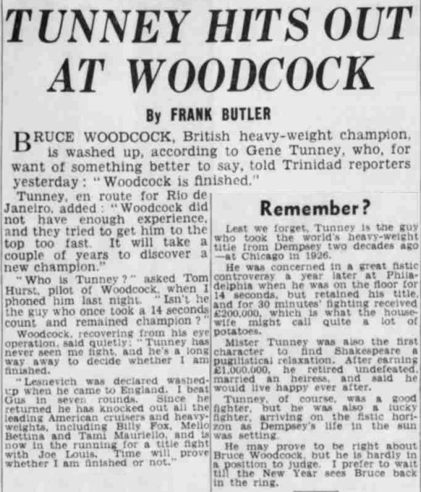BRUCE WOODCOCK, British heavy-weight champion, is washed up, according to Gene Tunney, who, for want of something better to say, told Trinidad reporters yesterday: “Woodcock is finished.”