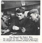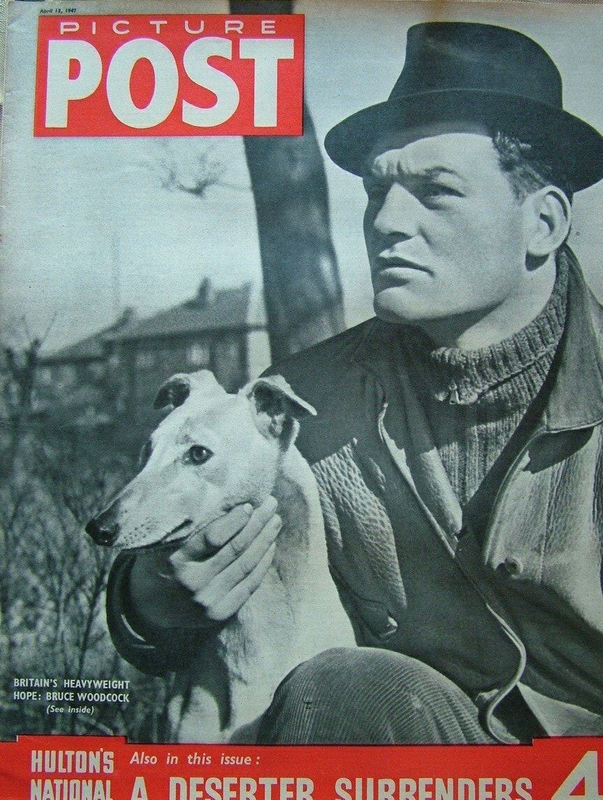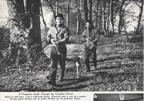 The increasing publicity circus around him was threatening to invade the sanctuary of Bruce's newly married life. This threat was dramatically realised later in the year when he was featured on the front cover of the upmarket Picture Post magazine on the 12th of April. The staged photo shows him dressed in trilby and roll-neck jumper with his greyhound Tip alongside. He doesn’t look at all comfortable in this artificial role. The photos in the inside feature look a bit more natural, showing him striding though the local woods on a rabbit shoot with his brother Billy. Both men are carrying shotguns, with Tip pacing beside them. Other shots show Bruce relaxing over games of snooker and dominos in his local workingman’s club with friends from the Plant railway works.