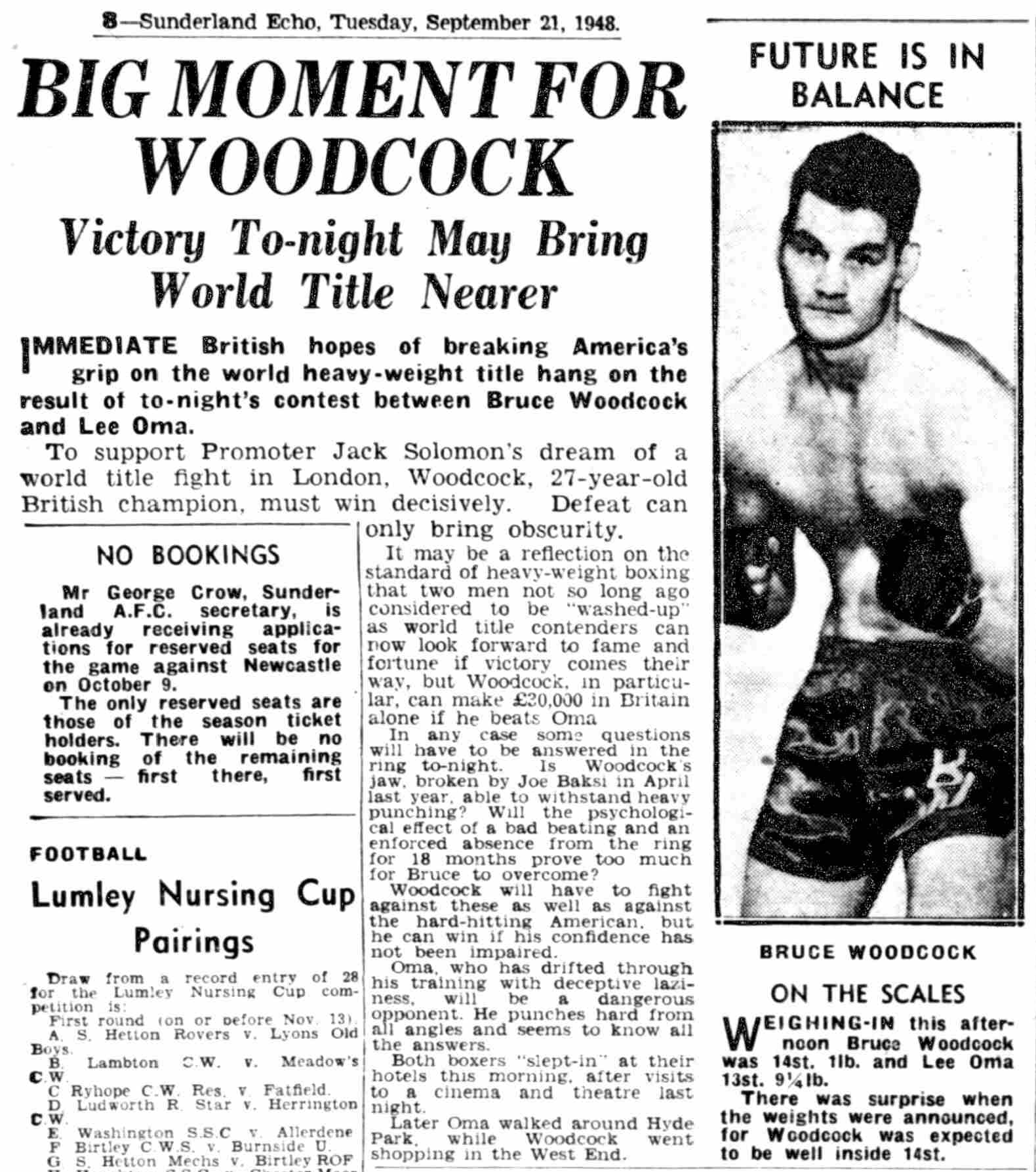“Blyth is a quiet little village a dozen miles from Doncaster, and Bruce Woodcock is training there for his fight with Lee Oma on Tuesday. The only person who knows why Woodcock pitched his camp at Blyth is Woodcock himself.