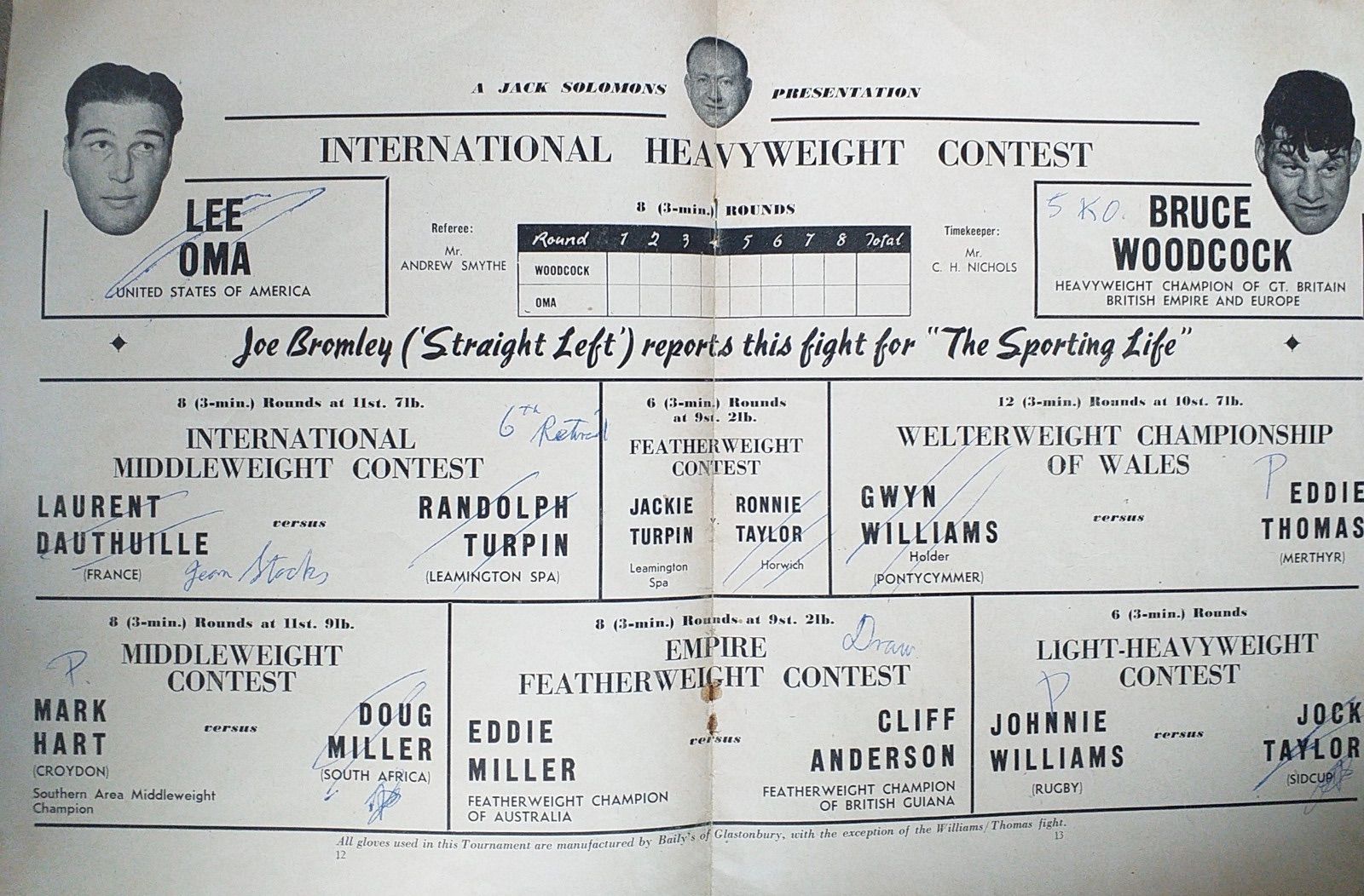 Jack Solomons, the promoter, declared after the fight: “What can I do about it. I was just as disgusted as anyone over Oma’s performance.” As to his plans for Woodcock, Solomons said: “I think Olle Tandberg, the Swedish champion, should be given a chance at Woodcock’s European title. Afterwards Lee Savold as a stepping-stone towards Joe Louis. This second fight would, of course, only come about if Woodcock beats Tandberg, assuming the British champion agrees.”